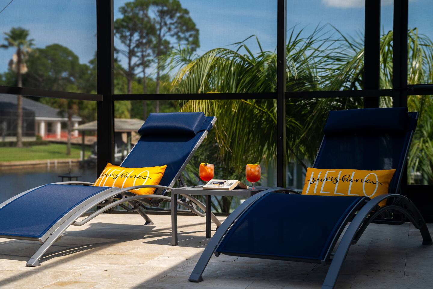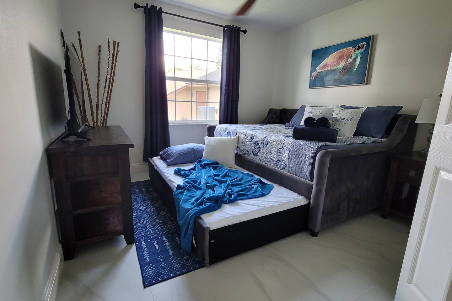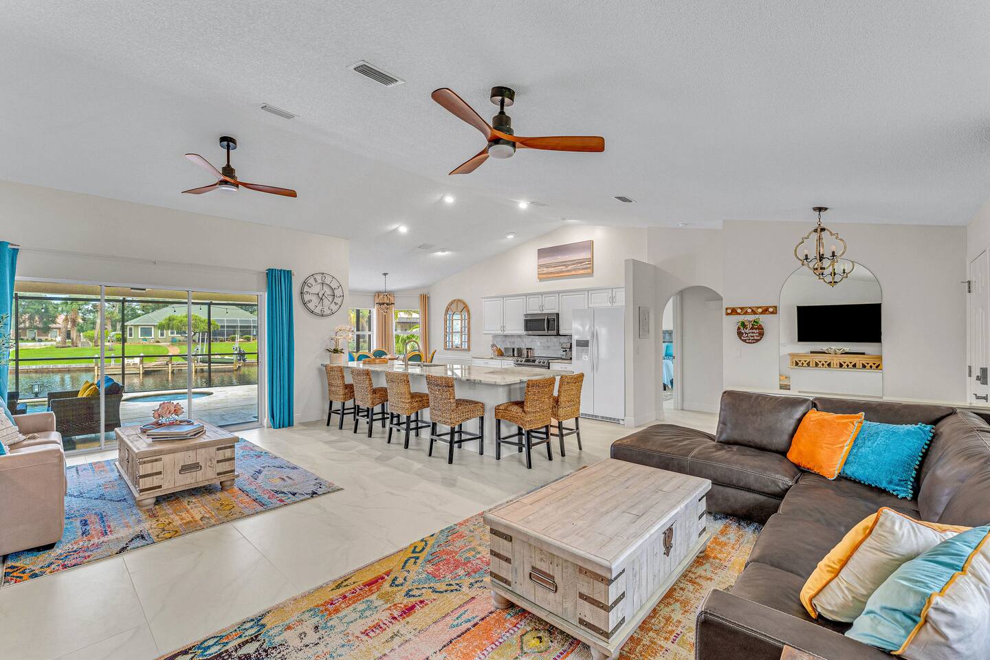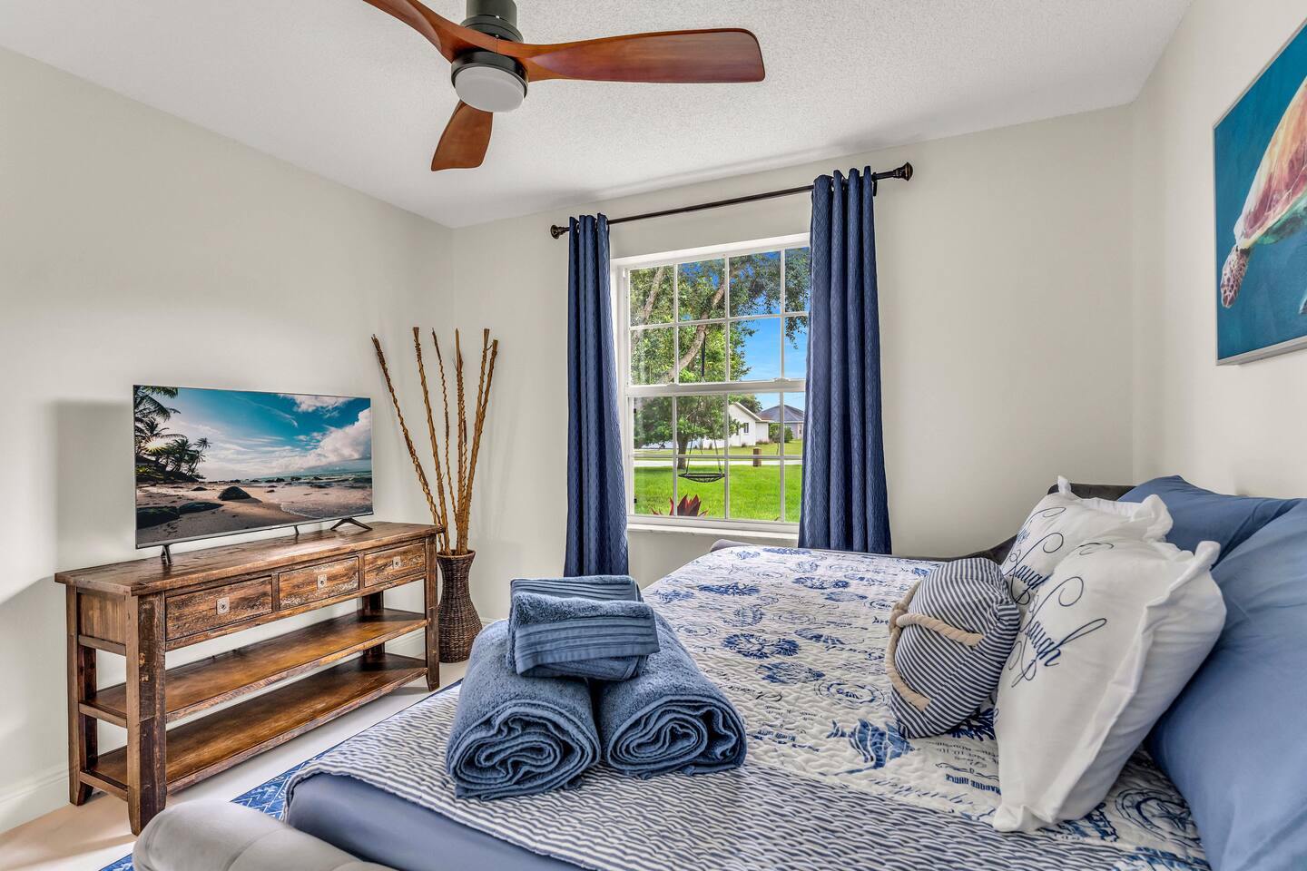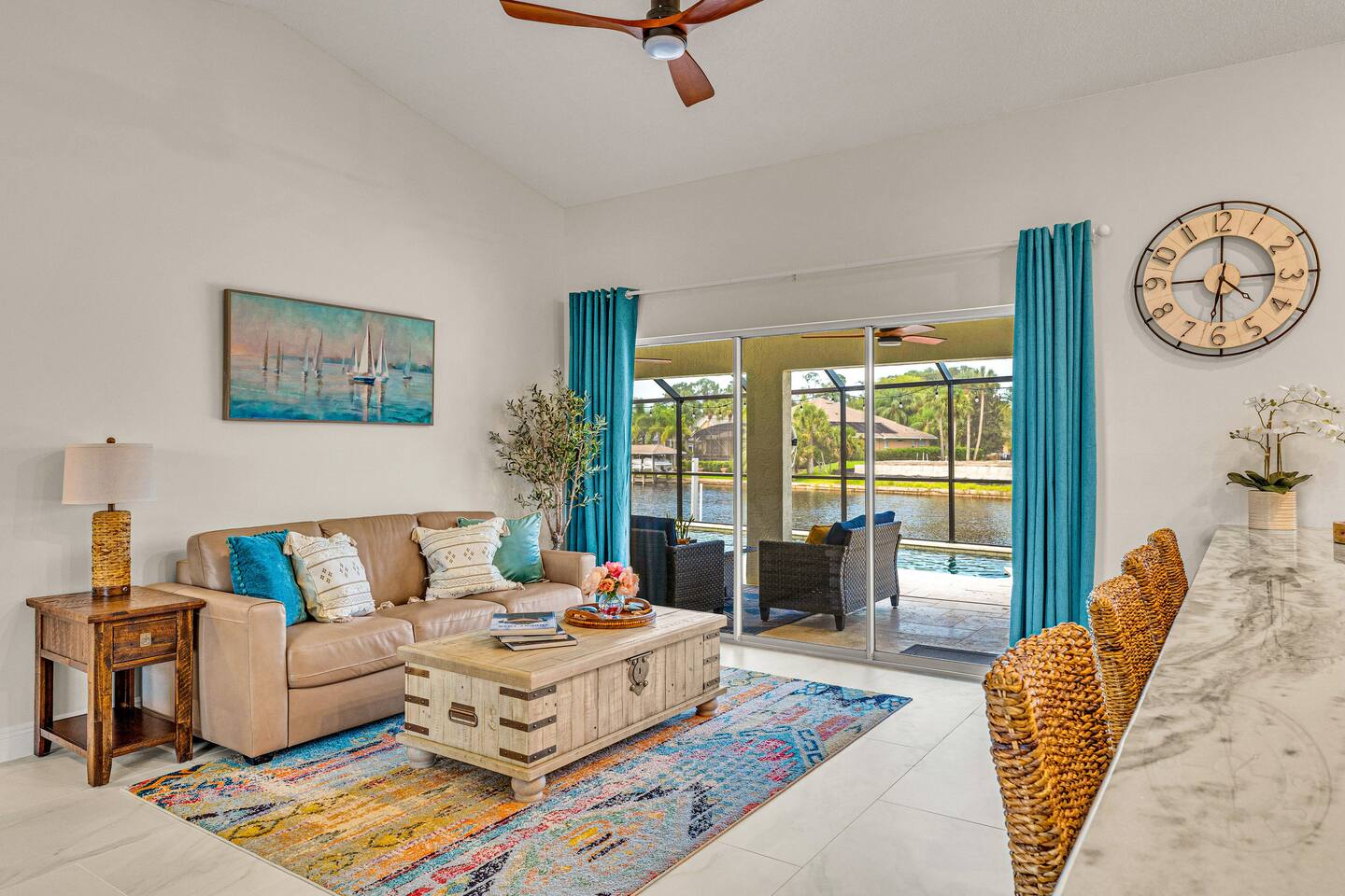 LAGUNA PARADISO: *Stunning 180+ degree saltwater canal views form the living room, dining area, master bedroom and Laguna Paradiso bedroom as well as the pool/spa area, firepit area and BBQ area. Fully renovated and immaculately maintained inside and out. Open floor plan with beach inspired décor. LIVING ROOM: * Overlooking the canal and pool/spa area *70" flat-screen Smart ROKU TV, surround soundbar system, two living areas with expandable queen size memory foam sofa bed, Board Games, Books and more. POOL AREA: Screened private pool and spa with a truly spectacular view to the lagoon *Heated pool (3.5ft to 6 ft deep), jetted heated six person spa. POOL HEATER MAY BE ADDED to your reservation in order to heat the pool or spa @ $30.00 a day for the duration of your stay. *We cannot guarantee pool and spa temperatures above certain degrees during the coldest months of the year. However, we will do our best to make your experience pleasant and memorable *Pool door alarms (can be set to on, chime or off) *Luxury lounge sitting area. Additional lounge chairs in the pool area for your relaxation and comfort KITCHEN: *Fully equipped with everything you need to cook your favorite dish. We offer a toaster, slow cooker, coffee maker, espresso machine, electric water kettle, blender, basic seasonings, tea and coffee and more… DINING AREA/BAR AREA: *The dining area has a round dining table for six people with an amazing view to the saltwater canal and the pool *Additional sitting space for six people is available at the oversized marble counter height bar area MASTER BEDROOM: *Direct water view of the saltwater canal and exotic palm trees *King size bed *Dedicated work area: fast Wi-Fi, La-Z-Boy office chair, desk, monitor, keyboard, mouse *55" Smart ROKU TV *Wireless chargers X 2 *Bedside lamps with USB charging ports *Walk-in closet with luggage stands *Blackout curtains LAGUNA PARADISO BEDROOM: *Direct water view of the saltwater canal and pool/spa area *Queen size bed *43" Smart ROKU TV *Wireless charger X 1 *Bedside lamps with USB charging ports *Large closet with luggage stands *Blackout curtains OCEAN BLUE BEDROOM: *Full daybed with a tween trundle. (Let us know in advance if you are in need of the expandable trundle bed, so we can provide you with extra linens) *43" Smart ROKU TV *Wireless charger X 1 *Bedside lamp with USB charging ports *Large closet with luggage stands *Blackout curtains GAME ROOM: *2 X Kayaks with paddles and life jackets *Pool table *Ping pong table *Air hokey * Foosball *Arcades *Nintendo Retro and 32" Smart TV *Cornhole *Tiki toss *Badminton *4 X beach chairs, beach umbrella, sand toys, child life vest BBQ AREA: *Covered BBQ gazebo area with a Weber grill and water view FIRE PIT AREA: * Make memories at the fire pit area overlooking the water FRONT YARD: *Tree swing for young children only. Sorry adults, the tree and swing are not strong enough to support adult body weight. PRIVATE DOCK: * Private Dock equipped with fishing pole stands and a sink *Bring your boat or jet ski and dock them (boat lift not available) *Nearest boat ramp: Bings Landing Boat Ramp located at: 5862 N Ocean Shore Blvd, Palm Coast, FL 32137 OTHER: *Washer/dryer *Starter pack of laundry pods, dishwasher pods, trash bags, paper towels, toilet paper, coffee, tea, cream *4 vehicle driveway.